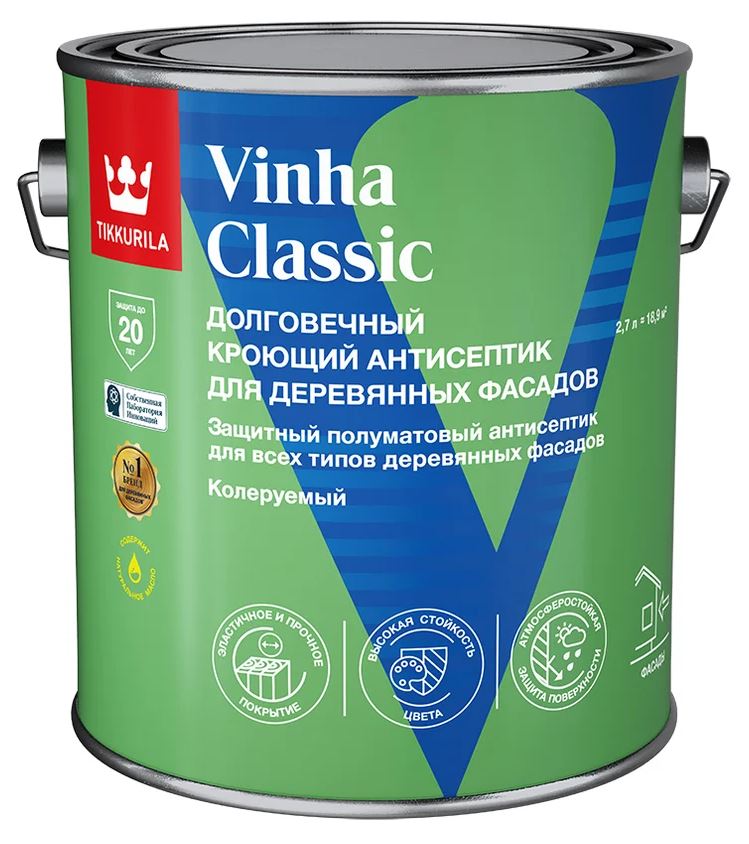 Защитный кроющий полуматовый антисептик для всех типов деревянных фасадов. Предназначена для окраски новых или обработанных ранее кроющей защитой Tikkurila Vinha Classic или лессирующими материалами наружных деревянных поверхностей, пиленых, строганных, бревенчатых поверхностей, а также термообработанной и пропитанной под давлением древесины. Подходит также для загрунтованных промышленным способом деревянных поверхностей. Применяется для обработки наружных стен, заборов, беседок, навесов и других подобных поверхностей. Не подходит для обработки пола.