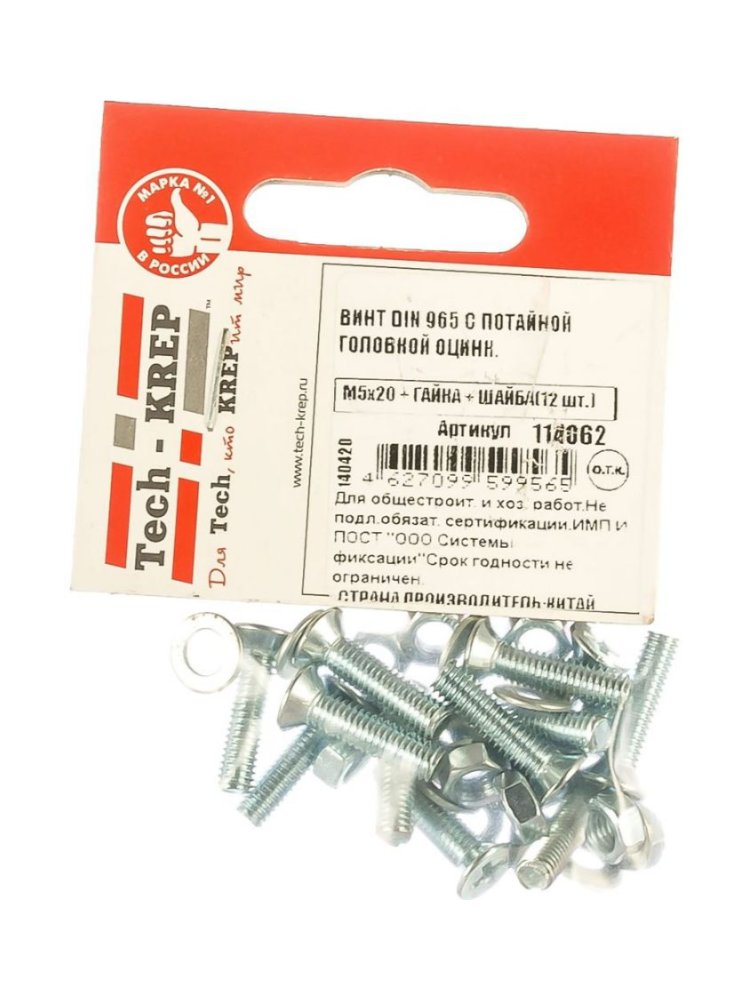 Винт DIN965 с потайной головкой оцинк. M5х20 + гайка + шайба (12 шт) - пакет Tech-Krep в Комсомольск-на-Амуре