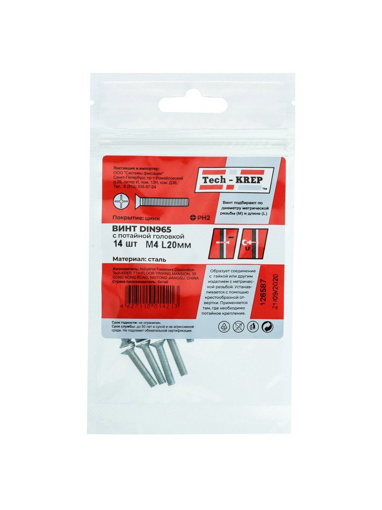 Винт DIN965 с потайной головкой оцинк. М4х20 (14 шт) - пакет Tech-Krep в Комсомольск-на-Амуре