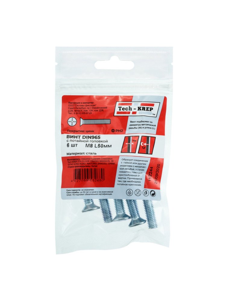 Винт DIN965 с потайной головкой оцинк. M8х50 (6 шт) - пакет Tech-Krep в Комсомольск-на-Амуре