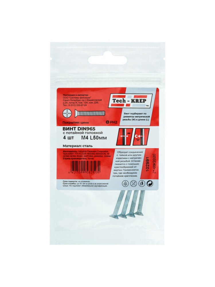 Винт DIN965 с потайной головкой оцинк. М4х50 (4 шт) - пакет Tech-Krep в Комсомольск-на-Амуре
