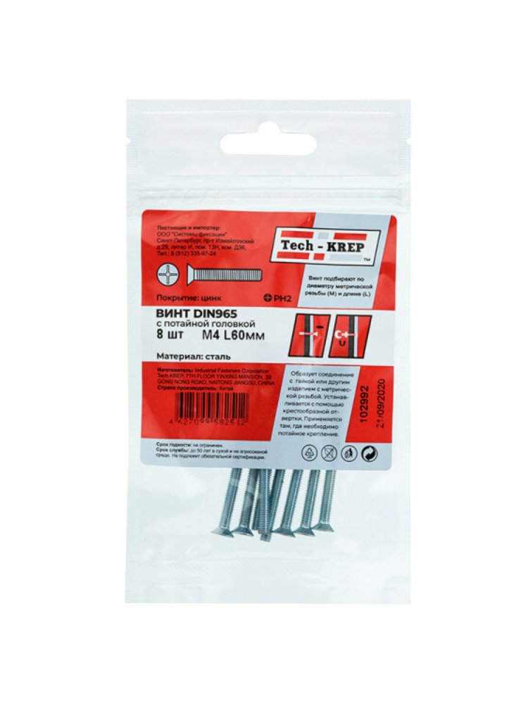 Винт DIN965 с потайной головкой оцинк. М4х60 (8 шт) - пакет Tech-Krep в Комсомольск-на-Амуре