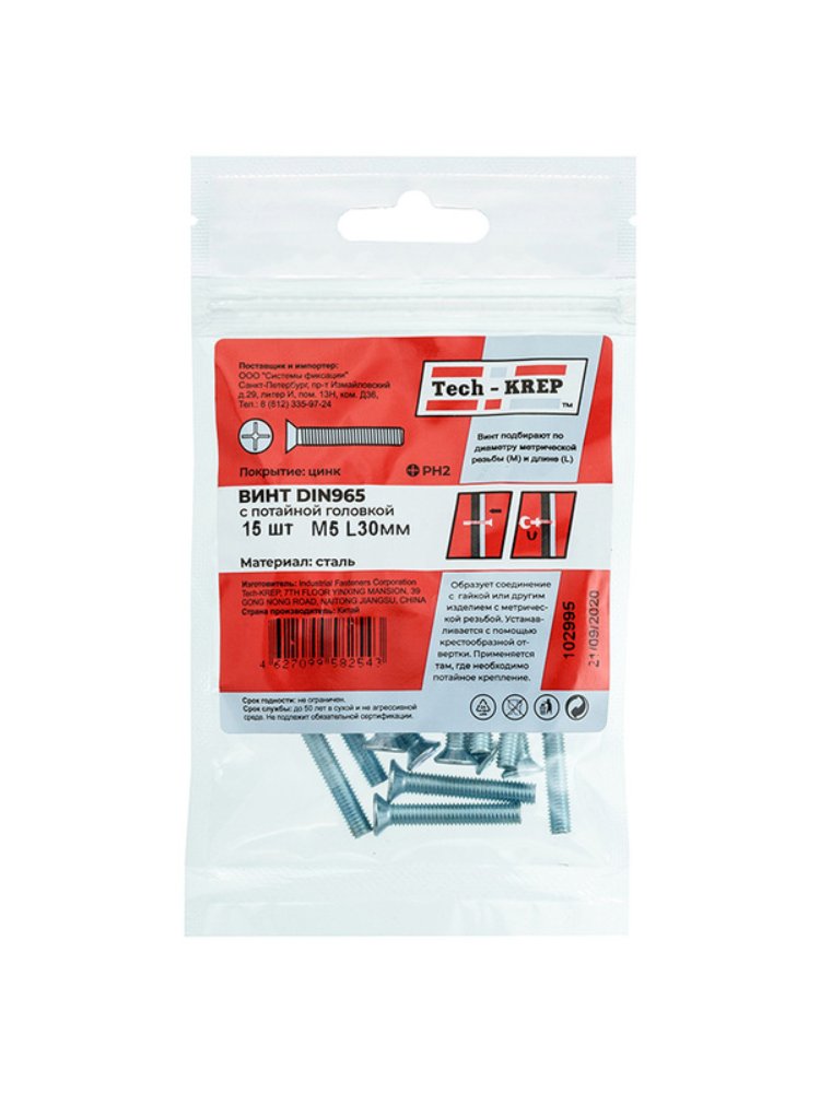 Винт DIN965 с потайной головкой оцинк. М5х30 (15 шт) - пакет Tech-Krep в Комсомольск-на-Амуре