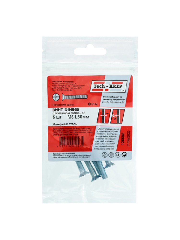 Винт DIN965 с потайной головкой оцинк. М5х60 (6 шт) - пакет Tech-Krep в Комсомольск-на-Амуре
