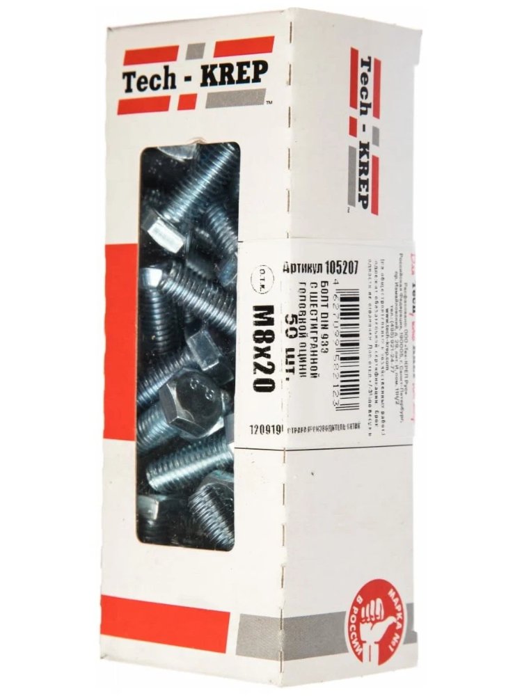 Болт DIN933 с шестигранной головкой оцинк. М8х20 (50 шт) - коробка с ок. Tech-Krep в Комсомольск-на-Амуре