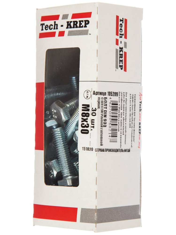 Болт DIN933 с шестигранной головкой оцинк. М8х30 (30 шт) - коробка с ок. Tech-Krep в Комсомольск-на-Амуре