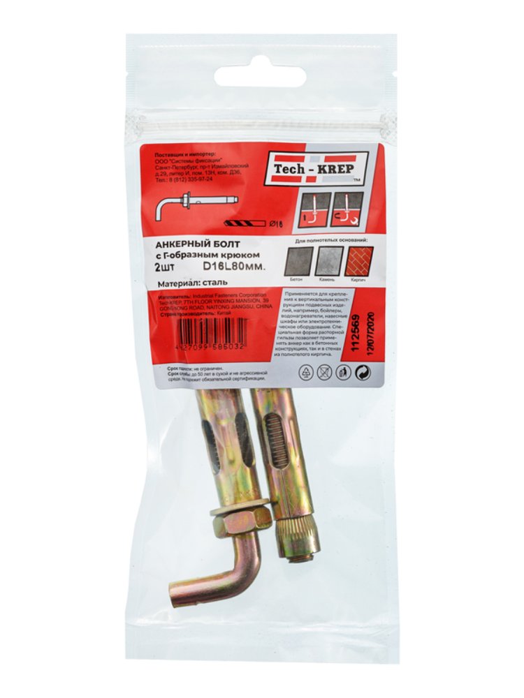 Анкерный болт с Г-обр. крюком HL 16x80 (2 шт) - пакет Tech-Krep в Комсомольск-на-Амуре