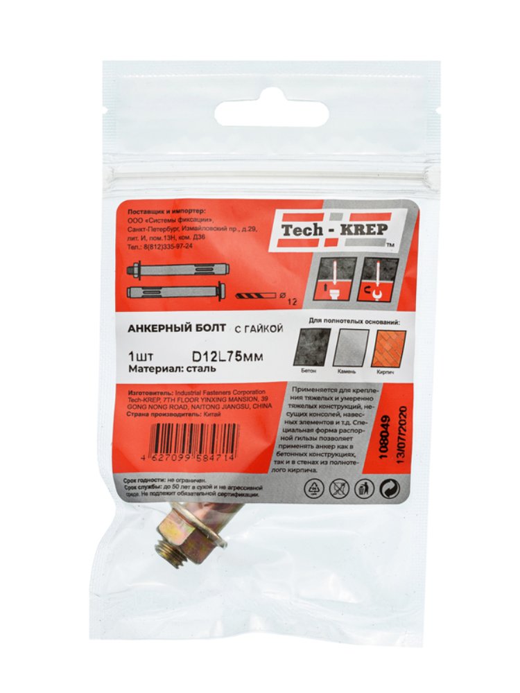 Анкерный болт с гайкой 12х75 (1 шт) - пакет Tech-Krep в Комсомольск-на-Амуре