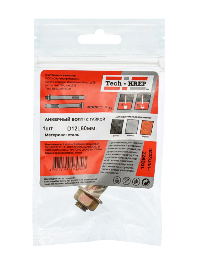 Анкерный болт с гайкой 12х60 (1 шт) - пакет Tech-Krep в Комсомольск-на-Амуре