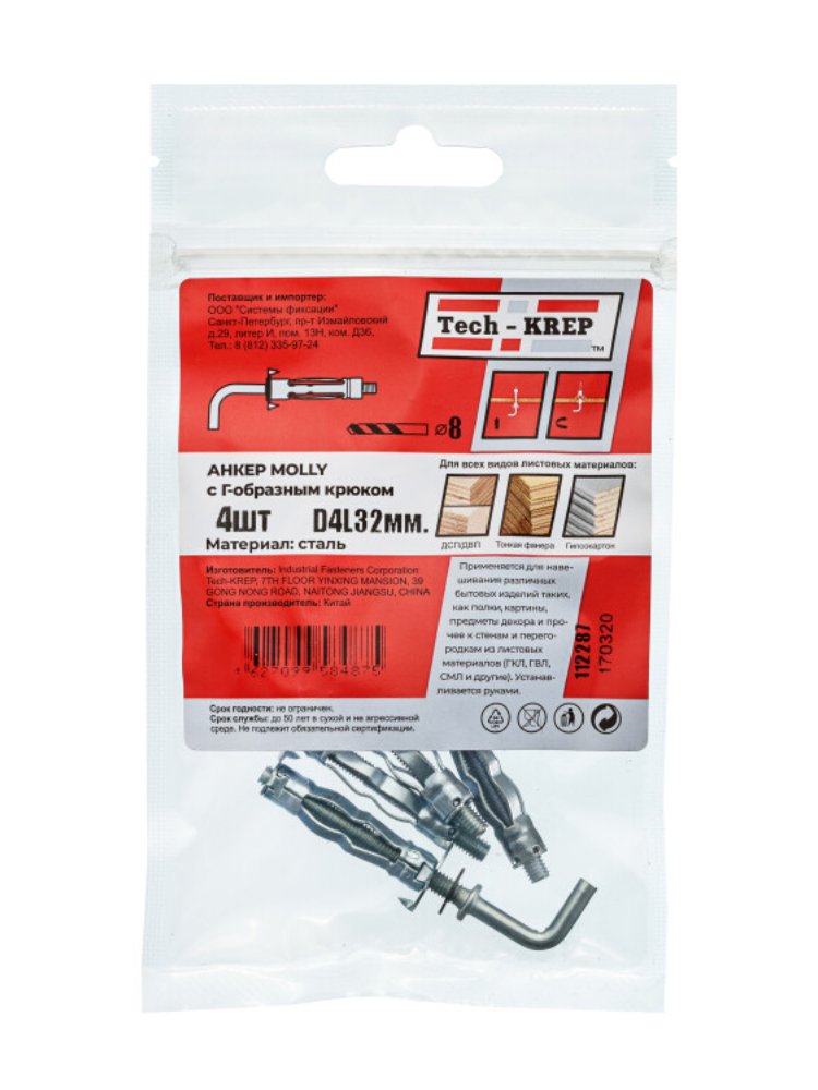 Анкер (дюбель) Молли W (с крюком) М4х32 (4 шт) - пакет Tech-Krep