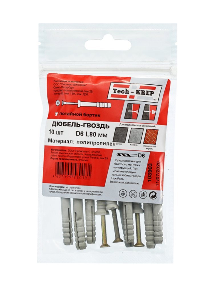 Дюбель-гвоздь 6х80 пот. манжета (полипропилен) черный (10 шт) - пакет Tech-Krep