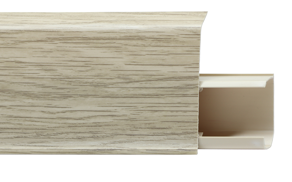 Утонченный и высокий профиль (72 мм) с острыми краями. Благодаря съёмной панели монтаж электрических проводов, покраска стен, оклеивание обоями возможны без демонтажа профилей. Конструкция позволяет монтировать и демонтировать плинтус без использования инструментов. Существует возможность размещения большого количества проводов, в том числе после монтажа. Специальная двухслойная технология: помимо слоя краски, дополнительно покрывается специальным лаком, благодаря чему его покрытие становится однородным, а это дополнительно защищает изделие от разного вида механических повреждений и вредного воздействия лучей УФ. Благодаря эластичному материалу, плинтус идеально прилегает даже к неровностям стен и полов.
