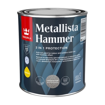 Краска для колеровки по ржавчине Tikkurila Metallista Hammer - специальная атмосферостойкая краска по ржавчине для внутренних и наружных работ. Сочетает в себе свойства преобразователя ржавчины, антикоррозионной грунтовки и декоративного финишного покрытия с молотковым эффектом. Позволяет легко проводить окраску металлических поверхностей без тщательной очистки от ржавчины и дополнительного использования грунтовки. Воск в составе материала создает барьер и защищает от проникновения влаги к металлу. Антикоррозионные компоненты краски взаимодействуют со ржавчиной и не дают ей распространяться дальше, надежно защищая металлическую поверхность на длительный срок. Отличная износостойкость. Стальные и чугунные конструкции, садовая мебель, гаражи, ограды, решетки и т.п. Не предназначена для полов и лестниц. Возможно применение в детских дошкольных учреждениях и помещениях административной группы, лечебно-профилактических учреждениях.