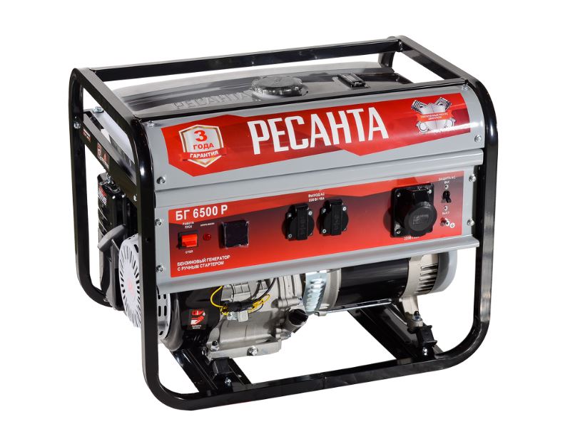 Электрогенератор Ресанта БГ 6500Р с максимальной мощностью 5500 Вт с ручным стартером и бензиновым двигателем 13 л.с. обеспечит автономное электроснабжение бытовой техники и профессионального оборудования в случае временного отключения или полного отсутствия электричества. Бензогенератор отличается небольшим потреблением топлива (бензин АИ-92) за счет наличия системы регулировки оборотов двигателя, это экономит ресурс агрегата и увеличивает срок его эксплуатации. Модель может обеспечивать электроэнергией сразу несколько устройств: на корпусе имеются 2 розетки 16А, а также дополнительная – 32А. Включение и отключение бензоэлектростанции производится вручную, наличие ручного стартера облегчает запуск агрегата в любых условиях. Генератор установлен на усиленную металлическую раму. В целях снижения вибраций рекомендуется использовать резиновые опоры, которые прилагаются в комплекте вместе с гайками.