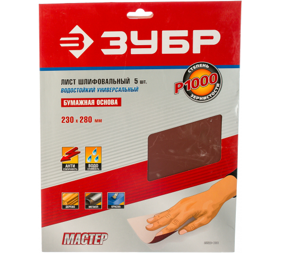 Шлифлист ЗУБР Р1000, 230*280мм на бумажной основе водостойкий, 5шт