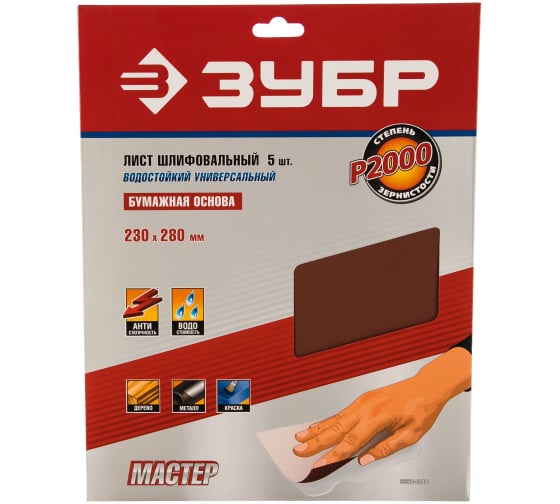 Шлифлист ЗУБР Р2000, 230*280мм на бумажной основе водостойкий, 5шт в Комсомольск-на-Амуре