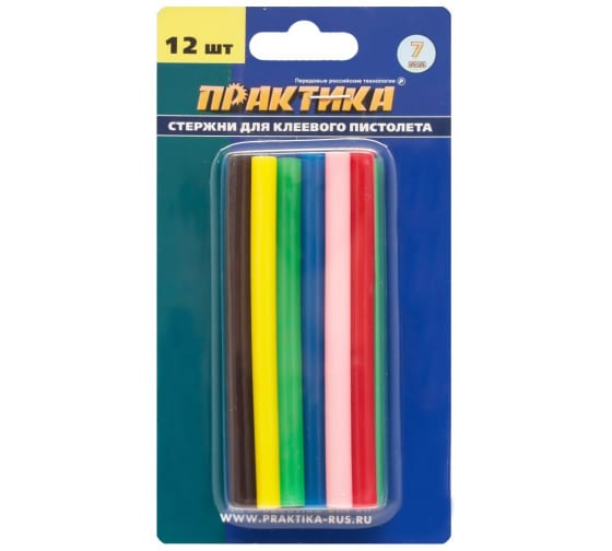 Клей для клеевого пистолета цветной (12 шт; 7х100 мм; 6 цветов) ПРАКТИКА 649-349 предназначен для прочного соединения цветных деталей из картона, полимерных материалов, линолеума, кожи, ткани, резины, керамики, фарфора, стекла. Температура плавления 85°С. Время застывания 35-45 с. Рекомендованная мощность пистолета от 30 Вт. Не содержит токсичных элементов.