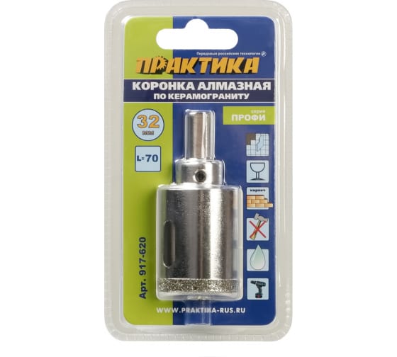 диаметр - 32 мм, Min диаметр - 32 мм, Мах диаметр - 32 мм, Мах глубина сверления - 35 мм, центрирующее сверло в комплекте - есть, держатель в комплекте - есть, по дереву - нет, по металлу - нет, по керамике - да, по стеклу - да, по пластику - нет, по нержавеющей стали - нет, по цветному металлу - нет, разборная - нет, тип сверления - мокрое, тип хвостовика коронки - цилиндрический с 3 гранями, размер хвостовика коронки - 10 мм