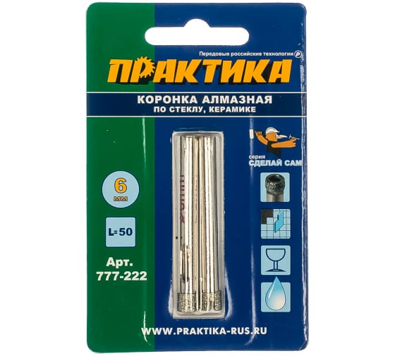 Коронка алмазная по стеклу и керамике ПРАКТИКА "Сделай сам" 6 мм, 2 шт в Комсомольск-на-Амуре