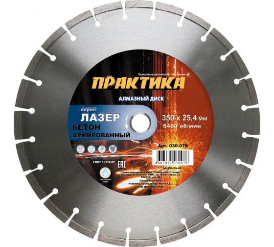 Диск алмазный сегментный ПРАКТИКА "Лазер-45-Бетон" 350х25,4 мм, сегмент 10 мм