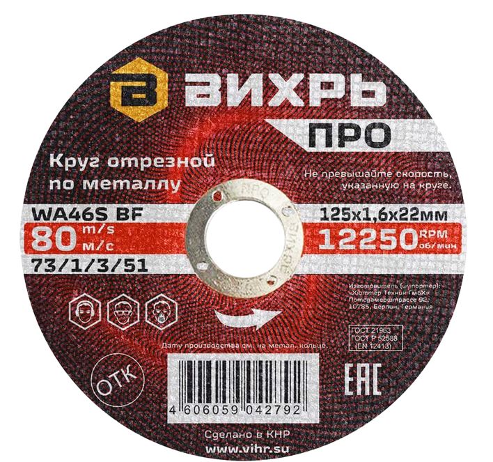 Круг отрезной по металлу ВИХРЬ ПРО 125х1,6х22 мм