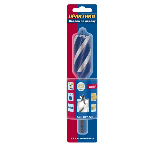 Сверло по дереву X-тип (28x165 мм; в блистере) ПРАКТИКА предназначено для сверления мягкой древесины и древесины средней твердости, ограниченно ДСП и гипсокартона. Изготовлено из высококачественной инструментальной стали У10. Четыре режущие кромки и четырехзаходная спираль обеспечивают высокую скорость сверления и аккуратные кромки отверстия. Резьбовое центрирующее острие обеспечивает самозатягивание сверла в материал, снижая усилия оператора. Шестигранный хвостовик 1/4’’ исключает проворачивание в кулачковом патроне и подходит для использования совместно с магнитным держателем 1/4’’.