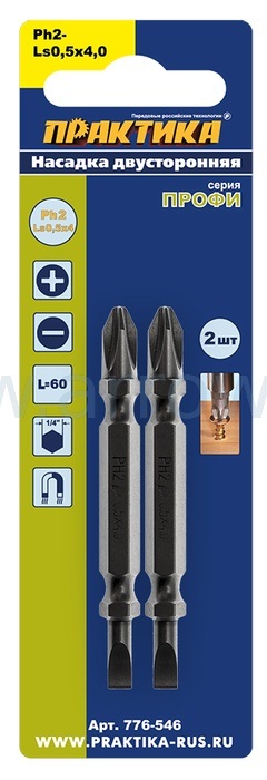 Бита ПРАКТИКА PH2/SL0,5*4 65 мм, двусторонняя, 2шт