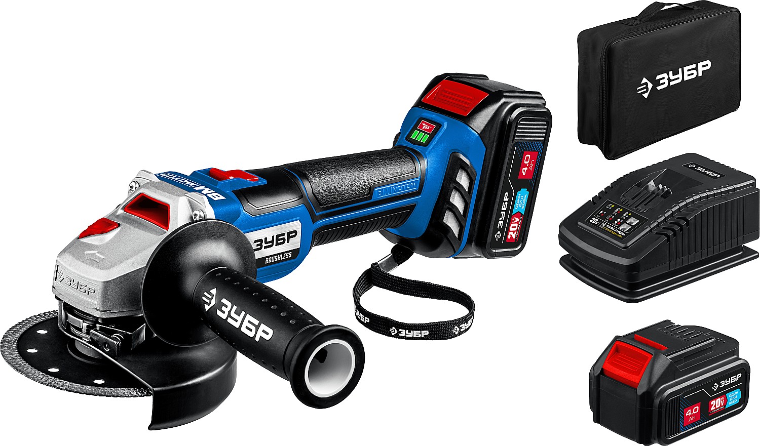 Шлифмашина угловая акк. ЗУБР 20В, бесщеточная, 2 АКБ*4Ач, сумка в Комсомольск-на-Амуре