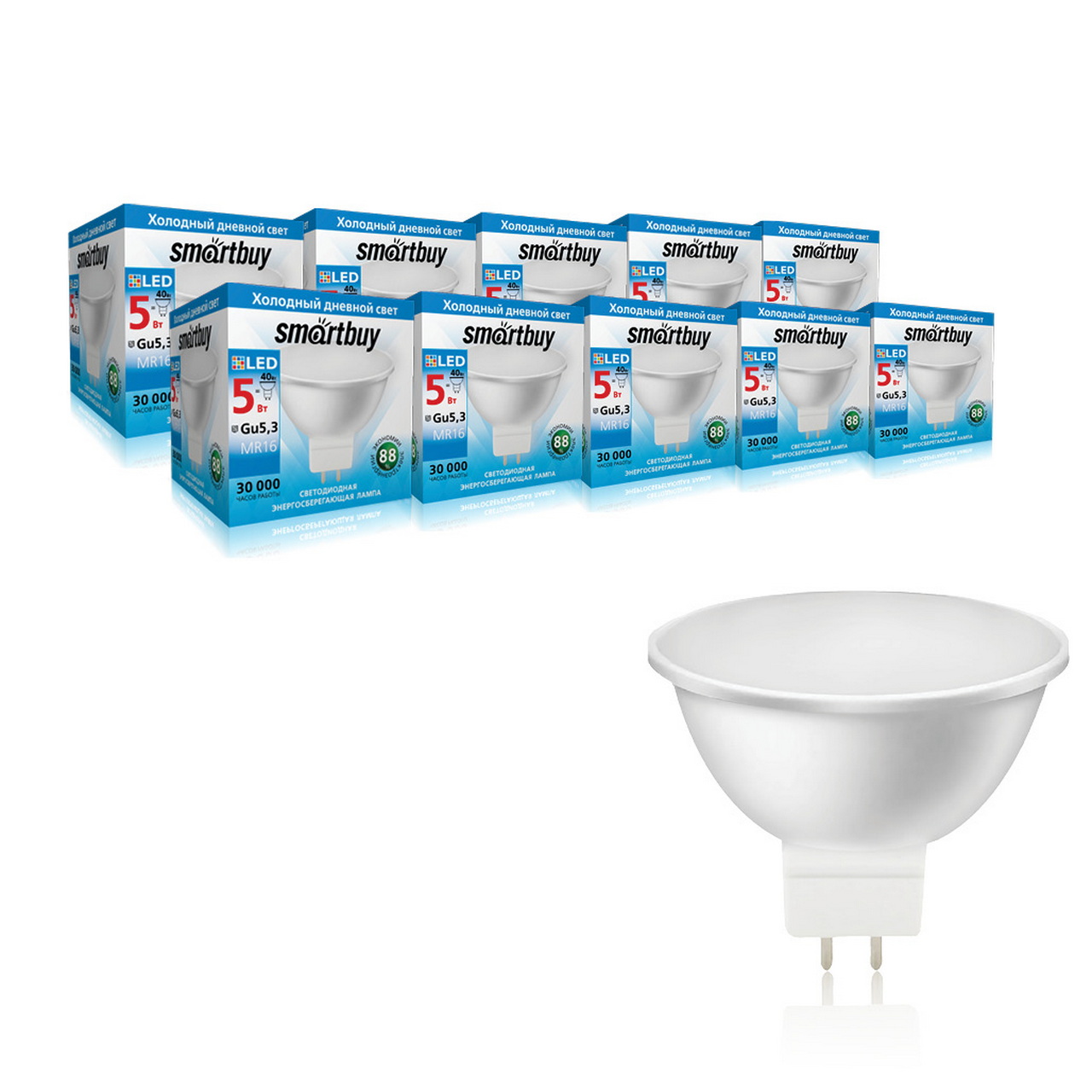 Светодиодные лампы повторяют форму и размеры стандартных галогенных ламп MR16 и PAR16 и идеально подходят к любому светильнику, в котором используются данные типы ламп. Такие лампы-рефлекторы особенно популярны в подвесных потолках. В светодиодных лампах серий Gu5.3 применяются высокоэффективные светодиоды, что обеспечивает высокую надежность и эффективность источников света до 80 лм/Вт. При этом коэффициент цветопередачи обеспечивается на уровне Ra>80.