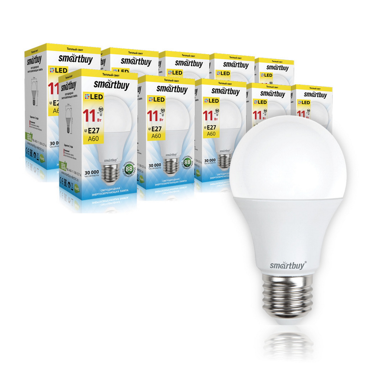 Лампа светодиодная LED-A60 11Вт-3000K-E27 Smartbuy