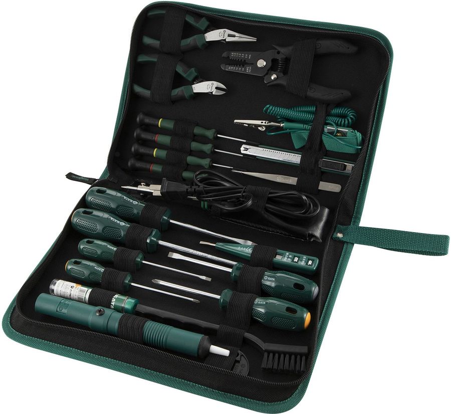 Работа мастера при проведении электротехнических, ремонтных и других видов работ не обойдется без использования набора инструментов SATA, состоящего из 19 предметов. Он используется в авторемонтных мастерских, на СТОА, на производственных участках точного машиностроения. При изготовлении элементов комплекта использована высококачественная сталь, отличающаяся долговечностью, прочностью, устойчивостью к механическим повреждениям. Набор инструментов SATA включает крестообразные отвертки PH0x75мм, PH1x75мм, PH2x100 мм, шлицевые – формата 3x75, 5x75 и 6x100 мм, а также индикаторную отвертку. Кроме того, в него входят миниатюрные бокорезы и тонкогубцы, а также другие инструменты, позволяющие выполнять необходимые операции.
