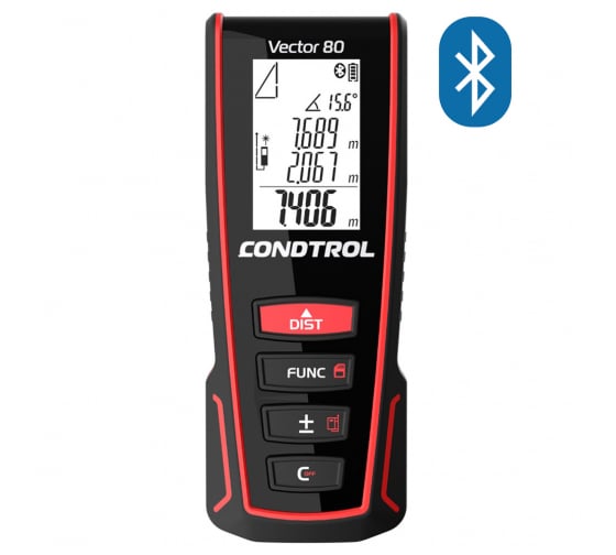 Лазерный дальномер Condtrol Vector 80 используется строителями, отделочниками, монтажниками и прочими мастерами. Позволяет быстро измерить расстояние как в помещении, так и на улице. Прибор имеет большое количество функций: трекинг (непрерывное измерение), сложение/вычитание, вычисление площади и объема, вычисления по теореме Пифагора, вычисления при помощи датчика наклона, вычисление расстояния между двумя точками. Измерения могут проводиться с передней или задней стенки корпуса, со штатива, откидной скобы. Встроенная функция Bluetooth дает возможность передавать полученные результаты на смартфон или планшет.