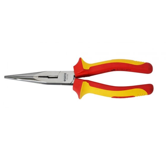 Плоскогубцы с изолированными рукоятками Sata - специализированный ручной инструмент, предназначенный для работы под высоким напряжением (до 1000 В переменного тока). Изделие выполнено из прочной и качественной хромованадиевой стали 60CR-V, для защиты от коррозии предусмотрено покрытие из железоникелевого сплава. Толщина рабочей части составляет 10 мм. Твердость инструмента составляет HRC40-50, твердость губок - HRC55-65. Плоскогубцы сертифицированы по правилам VDE, полностью соответствуют требованиям стандартов IEC/EN60900-2004, а также DIN 5236, ANSI B107.13M.