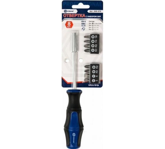 Отверточная рукоятка Ultra Grip с набором бит КОБАЛЬТ используется для работ с резьбовыми соединениями различного профиля. К отвертке прилагается набор бит: SL5 мм, SL6 мм, PH1, PH2, PZ1, PZ2, T15, T20, изготовленных из хром-ванадиевой стали. Для упрочнения рабочих частей применяется закалка до твердости 51 - 54 HRC. Стальные стержни оснащены магнитами, за счет этого происходит удержание и контроль крепежа во время работы. Специальная рукоятка удобно лежит в руке, а с помощью крючка инструмент можно повесить на пояс.